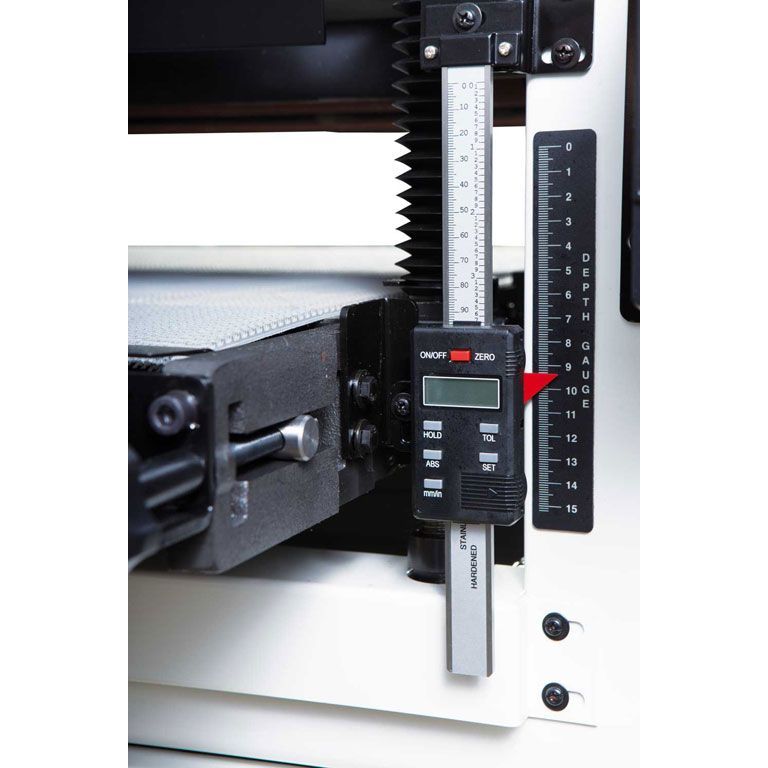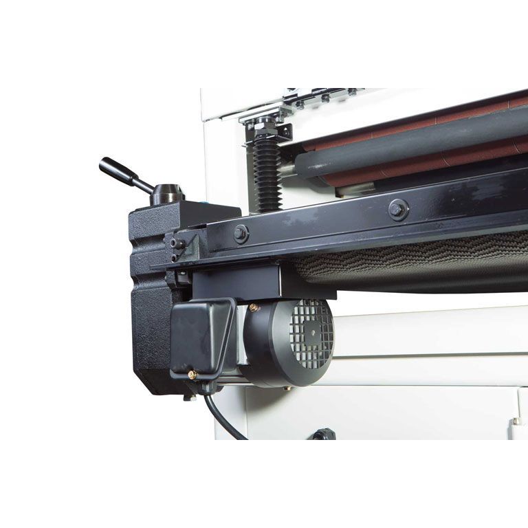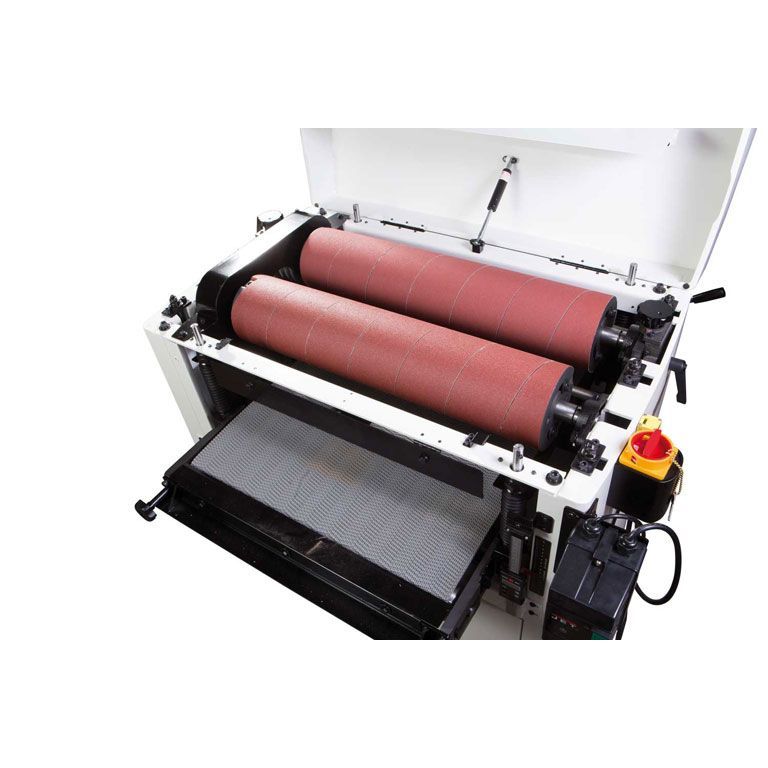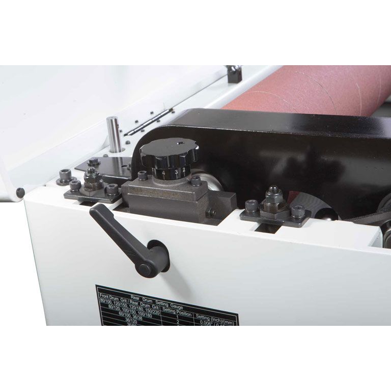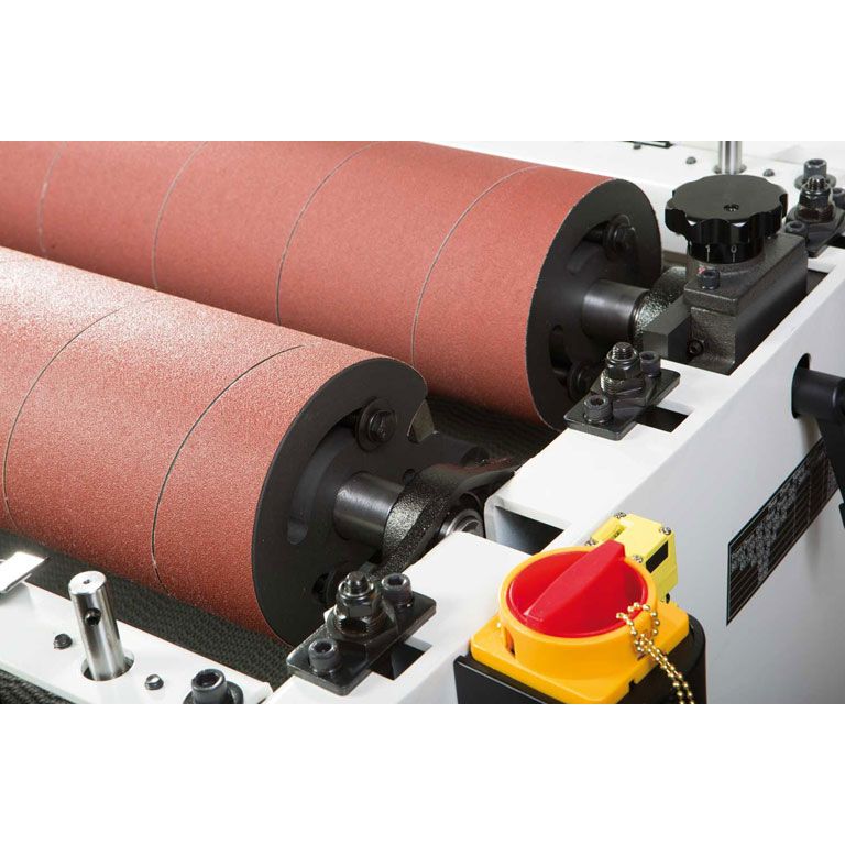 Конструкция с двумя валами позволяет использовать абразивы с разной зернистостью, то есть за один проход производить грубую и финишную шлифовку. Для достижения наилучшего результата предусмотрена точная регулировка положения выходного вала относительно приёмного, высоту которого подбирают в зависимости от зернистости абразива. Регулировка по высоте производится независимо за счет опускания транспортёрного стола. Он размещен на четырёх опорах и регулируется с точностью до 0,2 мм по всей ширине. На практике, разброс толщины после шлифовки на хорошо настроенном DDS-225 значительно меньше. При такой точности станки способны снимать за один проход до 1,5 мм по всей ширине, необходимо лишь правильно подобрать абразив и скорость подачи (2 или 3 м/мин).