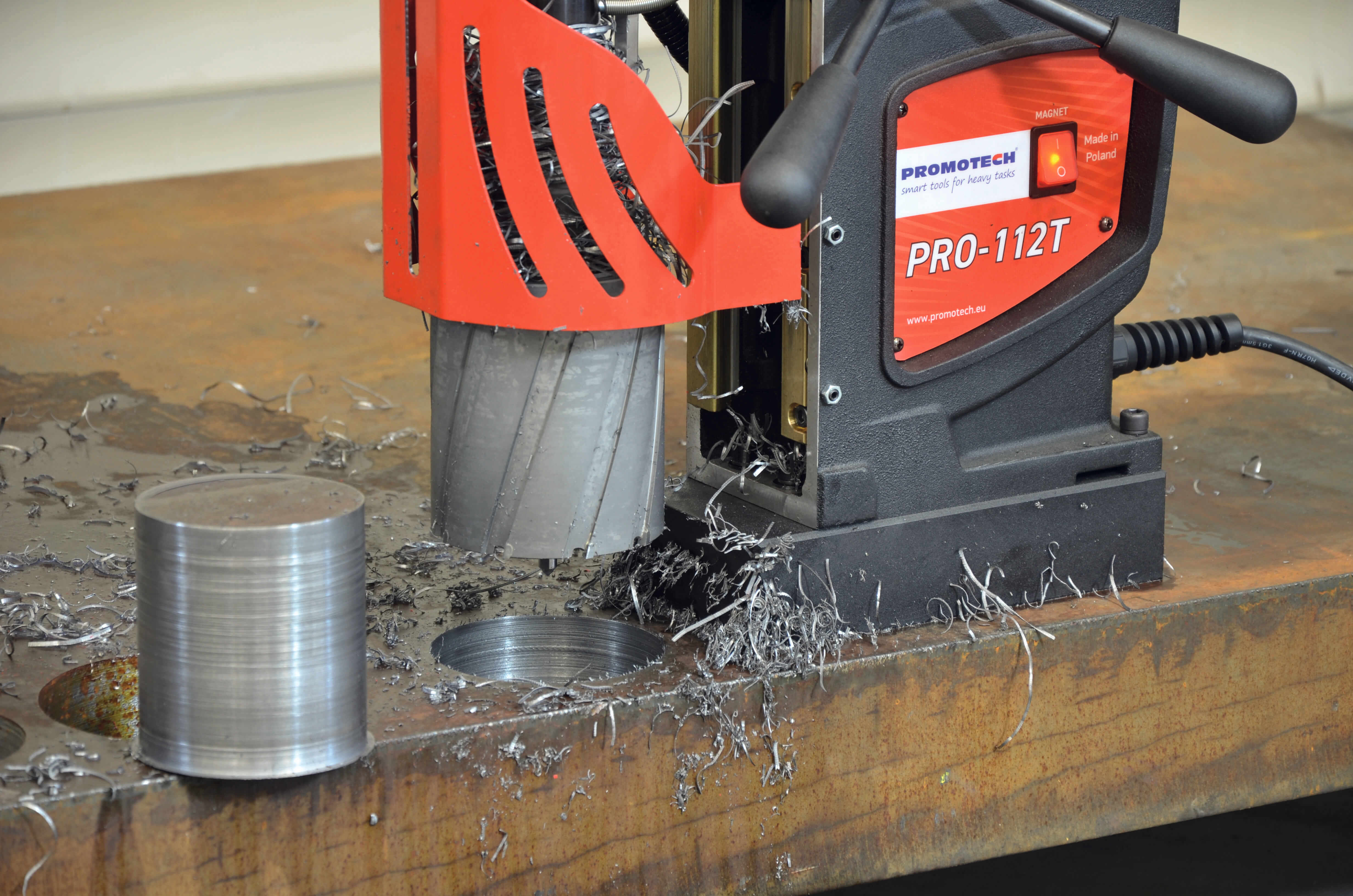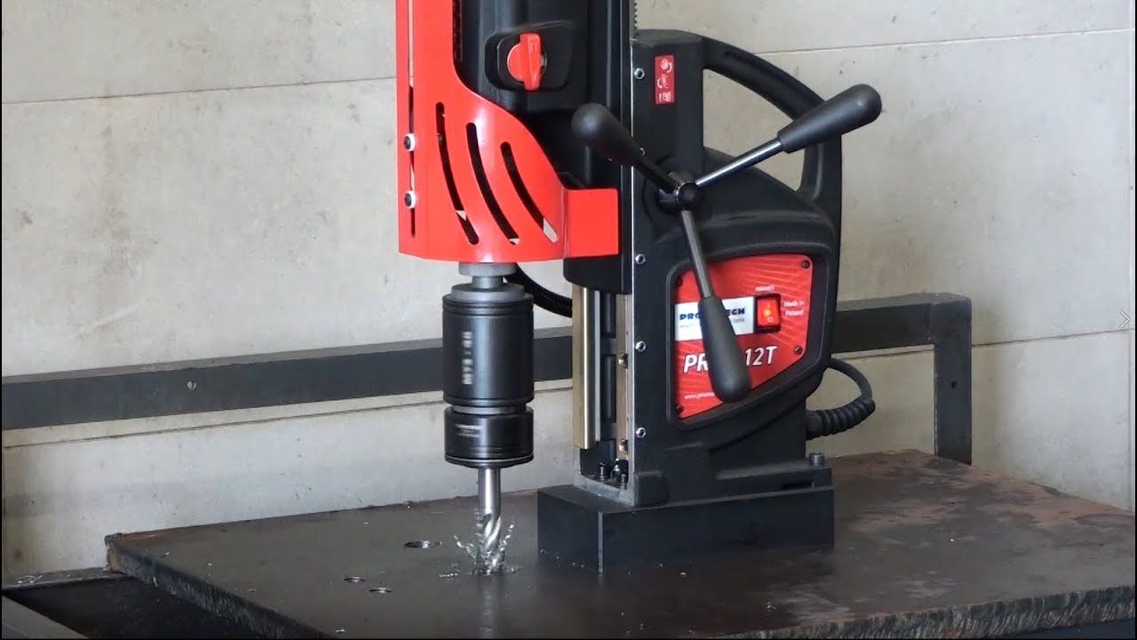 Сверлильный станок на магнитном основании PRO 112T– это новое поколение современных многофункциональных станков высокой мощности от Promotech. Магнитная сверлильная машина PRO -112Т представляет из себя промышленный сверлильный магнитный станок с большим крутящим моментом. Особое преимущество станка это литая конструкция корпуса, где привод и подвижные части образуют единый конструктивный элемент корпуса, обеспечивая жесткость крепления и точную фиксацию станка, его устойчивость, которые до этого время достигалась только в стационарных станках. Моноблочная конструкция , редуктор-суппорт, саморегулирующиеся направляющие исключают появление люфта, тем самым увеличивают срок эксплуатации и надёжность машины PRO 112T. В сверлильной машине на магнитном основании применен 4-х скоростной металлический редуктор позволяющий работать на малых оборотах, обеспечивая высокий крутящий момент без потери мощности.