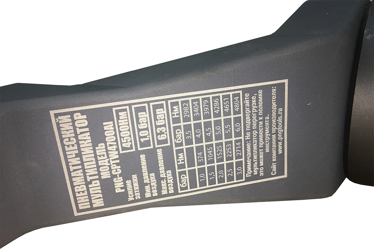 Мультипликатор ПНГ МП-4500ПА имеет прочную и удобную конструкцию весом всего 12,5 кг. Небольшой диаметр корпуса дает возможность закручивать в ограниченном пространстве. Рукоятку можно повернуть вокруг продольной оси инструмента на угол до 360 градусов, подобрав таким образом наиболее удобное для обхвата положение. Z-образная опора в передней части инструмента необходима для сдерживания сильного реактивного момента - ею мультипликатор упирается в соседнюю гайку или болт. Для контроля усилия затяжки используют манометр, встроенный в блок подготовки воздуха, а также в соответствии с тарированной таблицей.
