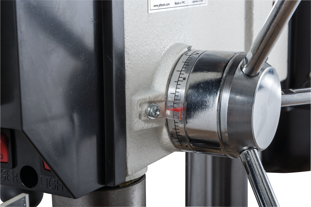 JWDP-12 — настольный сверлильный станок профессионального класса, подходящий для универсального (дерево и металл) применения. Основная отличительная черта этой модели – клиноременный вариатор, позволяющий плавно бесступенчато изменять скорость вращения шпинделя. Такая конструкция механизма ускоряет настройку в зависимости от диаметра сверления: вместо снятия и последующей установки ремня достаточно перевести рычаг, причем делают это, не выключая мотор. При этом фактическая скорость вращения шпинделя будет отображаться на цифровом дисплее, что особенно важно при работе с металлом, когда ограничения по частоте вращения режущего инструмента гораздо более строгие, чем при работе с деревом.