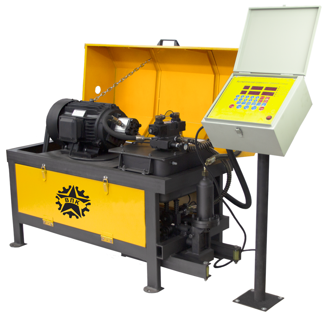 Электродвигатель через шкив и ремни передает вращение на выпрямляющую раму, которая одновременно выполняет функции подачи и выпрямления арматуры. Выпрямление происходит за счет давления обкатных роликов на арматуру. Резку осуществляет нож при помощи гидропривода, давление в гидроприводе создается масляным насосом.