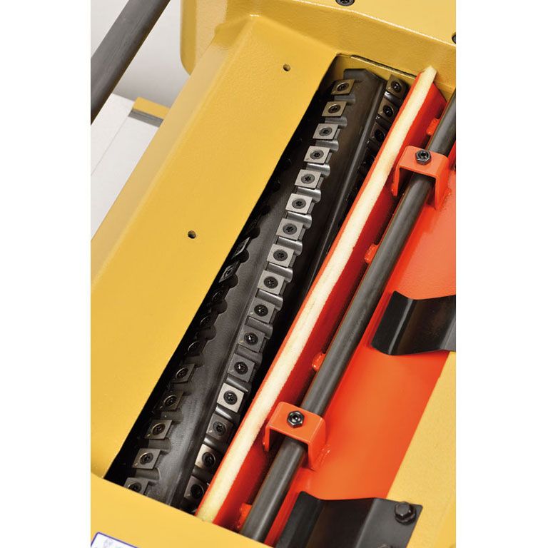 Powermatic 15HH - мощный профессиональный рейсмусовый станок с шириной строгания 380 мм, штатно оборудованный сегментированным ножевым валом helical. Его рабочая часть – твердосплавные четырехсторонние лезвия с радиусной кромкой. Они расположены спирально в несколько рядов, благодаря чему входят в заготовку последовательно. Это снижает вибрацию, шум и способствует более чистому строганию без сколов на сучках и в местах обратного направления волокон. Немаловажно и то, что отходящая стружка мельче обычной, лучше удаляется пылеотсосом и занимает меньше места в накопителях. По мере износа ножи переворачивают (до трех раз) и лишь потом заменяют; никаких регулировок при этом не требуется.