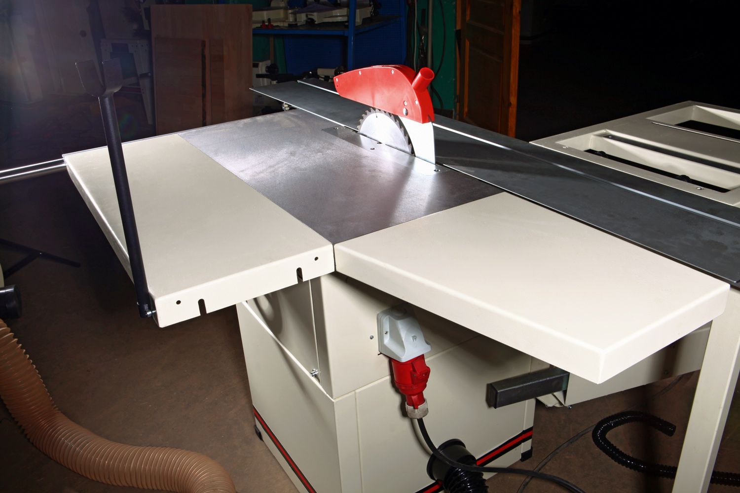 Основа конструкции пилы – металлическая тумба, внутри которой установлены асинхронный трехфазный двигатель, механизмы регулировки по высоте и углу наклона пильного модуля (он выполнен из чугунной отливки) и пылесборный кожух со 100-миллиметровым патрубком подключения к вытяжной установке. Рабочий стол чугунный, вдоль него проходит жесткая цилиндрическая направляющая, по которой перемещается параллельный упор с эксцентриковой фиксацией – эти решения полностью соответствуют профессиональному стандарту. Рабочая поверхность может быть увеличена за счет установки расширителя и удлинителя, сделанных из листовой стали – они штатно поставляются вместе с пилой.