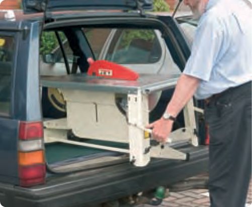 Для облегчения транспортировки опорные ноги складываются примерно на половине высоты, благодаря чему станок легко помещается в багажник легкового автомобиля. Перемещать инструмент по площадке легко в одиночку: колеса, откидные рукоятки и небольшой вес это позволяют. При работе в мастерской или в помещении можно воспользоваться системой аспирации, которая собирает опилки и сверху, и снизу пильного диска, после чего они удаляются системой аспирации через единый 100-миллиметровый патрубок.