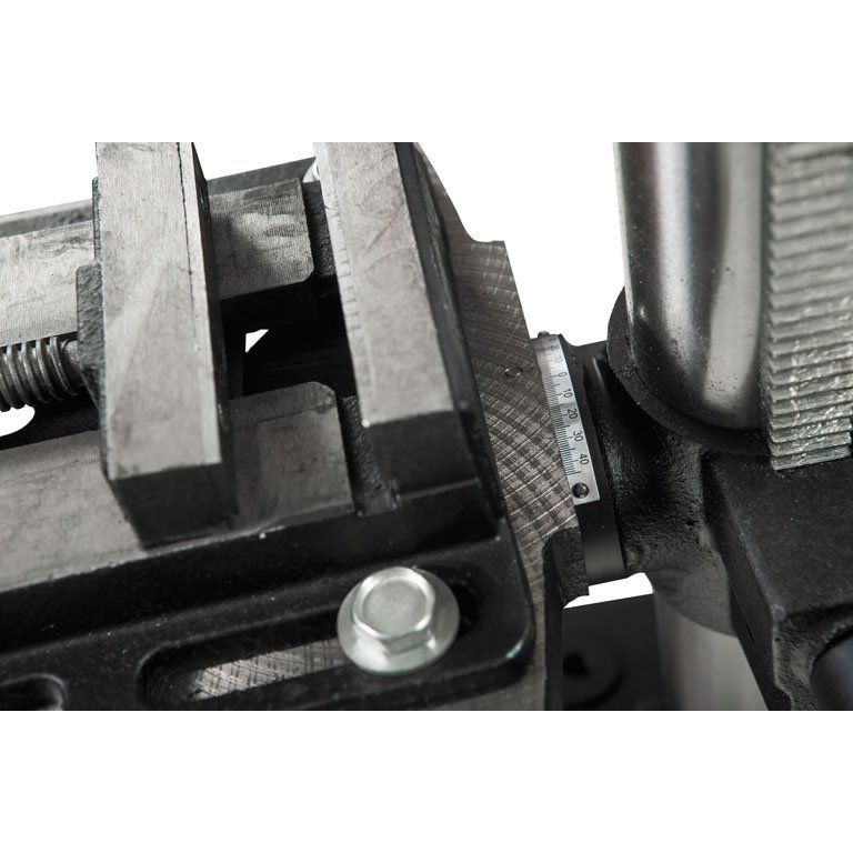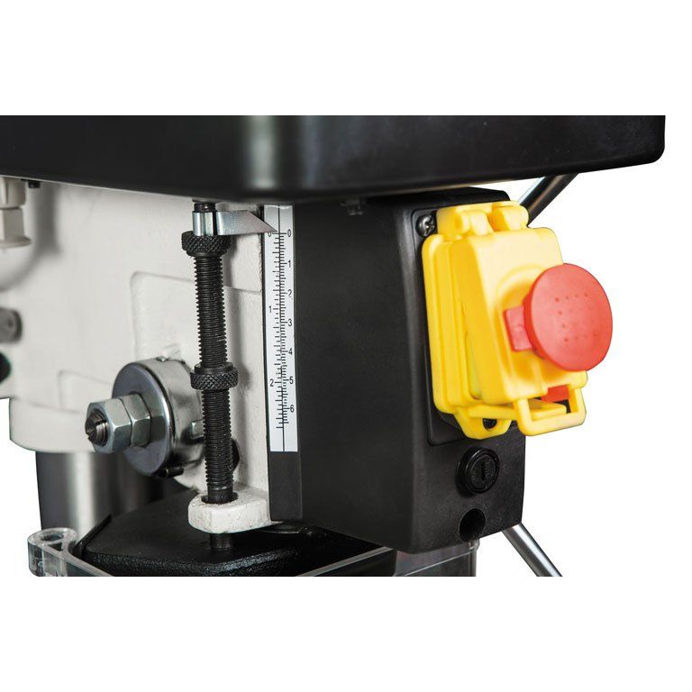 Станок укомплектован чугунным столом, регулируемым по высоте и по углу установки. Сверлильная часть тоже выполнена из чугунного литья. Для контроля глубины сверления предусмотрена шкала с миллиметровой и дюймовой разметкой, а также регулируемый ограничитель. Скорость вращения шпинделя меняется в широких пределах перестановкой ремней в редукторе (он имеет две ступени).